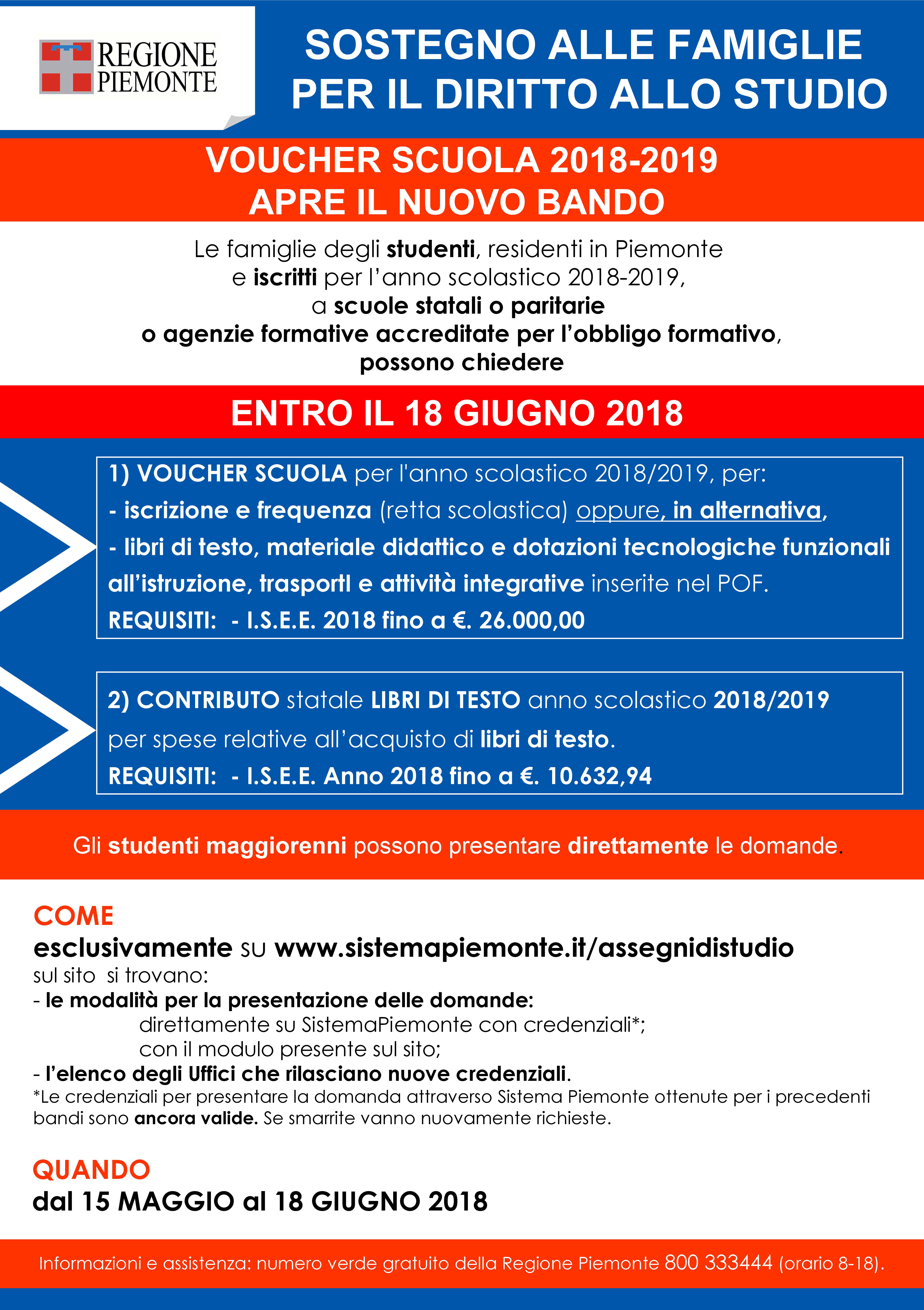 Apre il nuovo bando voucher scuola 2018/2019 rivolto alle famiglie degli studenti residenti in Piemonte e iscritti per l'anno scolastico 2018/19 a scuole statali o paritarie o agenzie formative accreditate per l'obbligo formativo.