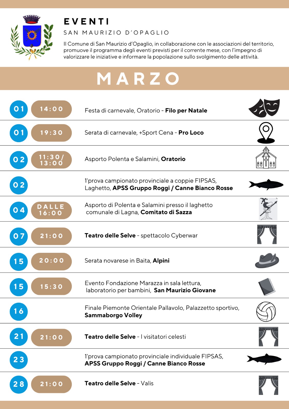 Il Comune di San Maurizio d'Opaglio, in collaborazione con le associazioni del territorio, promuove il programma degli eventi previsti per il corrente mese, con l'impegno di valorizzare le iniziative e informare la popolazione sullo svolgimento delle attività.
