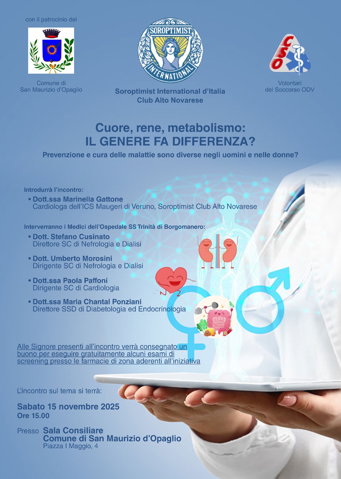 Un evento gratuito dedicato alla prevenzione e cura delle malattie in uomini e donne, organizzato da Soroptimist Club Alto Novarese con il patrocinio del Comune di San Maurizio d'Opaglio e la collaborazione dei Volontari Soccorso San Maurizio.