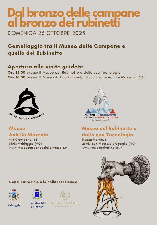 In occasione del gemellaggio tra il Museo Antica Fonderia Achille Mazzola 1403 e il Museo del Rubinetto e della sua Tecnologia saranno disponibili visite guidate che permetteranno di conoscere l'utilizzo del bronzo nelle campane e nei rubinetti.