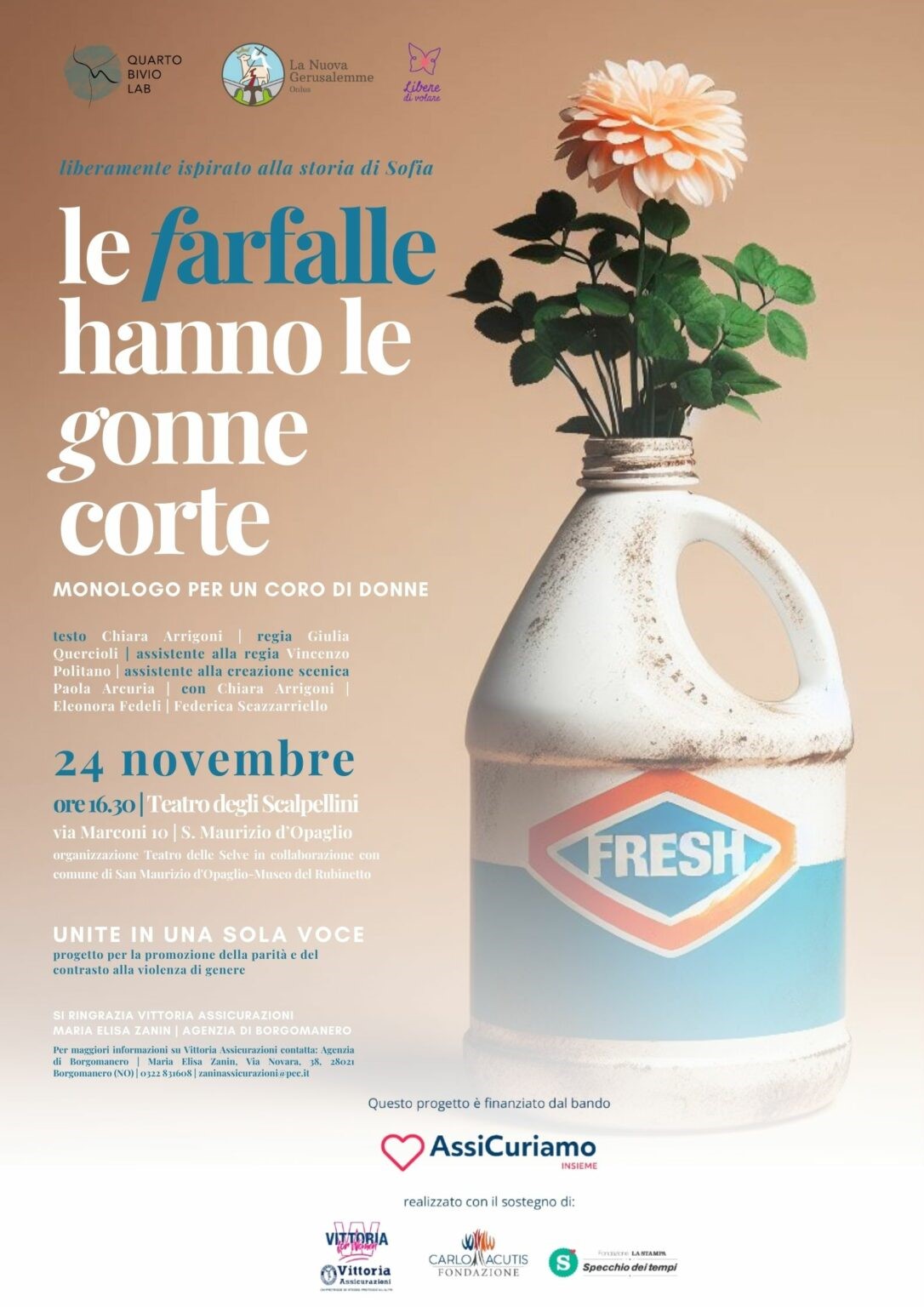 Parte del progetto UNITE IN UNA SOLA VOCE nell’ambito della promozione della parità e contrasto alla violenza di genere finanziato dal bando AssiCuriamo insieme promosso dalla Fondazione Specchio dei Tempi con il sostegno di Vittoria Assicurazioni e Fondazione Carlo Acutis.